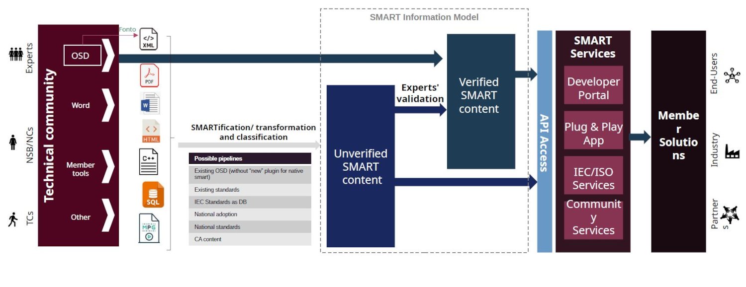 L’ISO et l’IEC ont lancé un programme SMART en 2021. Ce programme a permis dans un premier temps de mieux appréhender les besoins et attentes des utilisateurs dans leur relation à la norme. Il a ensuite permis de mettre en exergue les fondations nécessaires à mettre en place par les organismes de normalisation ainsi que le besoin de collaboration en étant toujours plus tourné vers les besoins utilisateurs. Une vision illustrant de bout en bout les impacts des SMART Standards a pu être proposée.