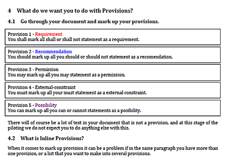Depuis 2020, le CEN et le CENELEC se sont quant à eux intéressés au développement de nouvelles fonctionnalités pour la plateforme Online Standards Development afin de pouvoir tagguer certains enrichissements dès les phases de rédaction (ex : les provisions – exigences, recommandations, possibilités, permissions, voir capture ci-dessous). Cet outil commence à être déployé par le CEN et le CENELEC depuis janvier 2025.