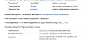 "CurveName" "secp256k1" elliptic curve to use "HashingMethod" "SHA256" how to hash the contents of the file "SignatureType" Automatic mode of digital signature generation - Possible settings for "CurveName" are listed in $CryptographicEllipticCurveNames.