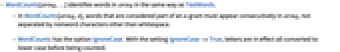 - In WordCounts[string,n], words that are considered part of an n-gram must appear consecutively in string, not separated by nonword characters other than whitespace.