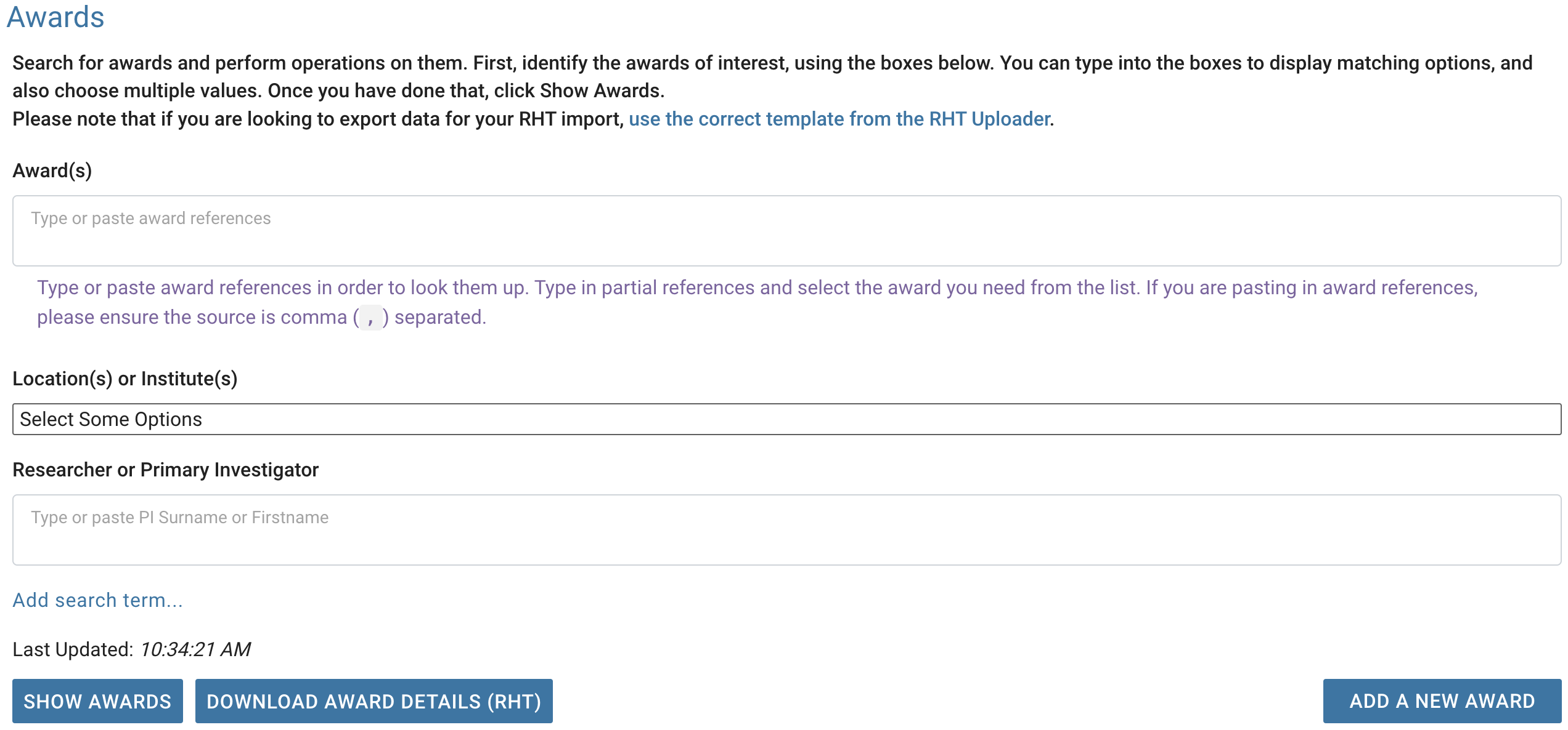 Awards allows you to locate specific awards. You can search by award reference, award title, funder, or award holder name.