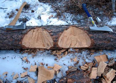 This past winter, the curiosity bug bit me, and I was interested to see how an Estwing 26" Camp Axe would fare against a traditional wood-handled Best Made Hudson Bay Axe in a chopping contest.