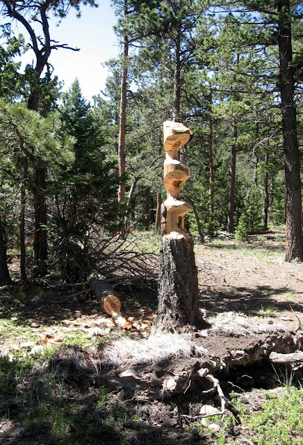 Yesterday, I was out testing felling axes on a Fir tree that had been blown down by a wind storm sometime ago. I chopped the fourth test notch a little too deep, and the slim piece of wood joining the two sides of the tree snapped, causing the trunk to stand back up from the weight of the rocks and soil attached to the roots. The result -- a rather crazy looking totem pole!