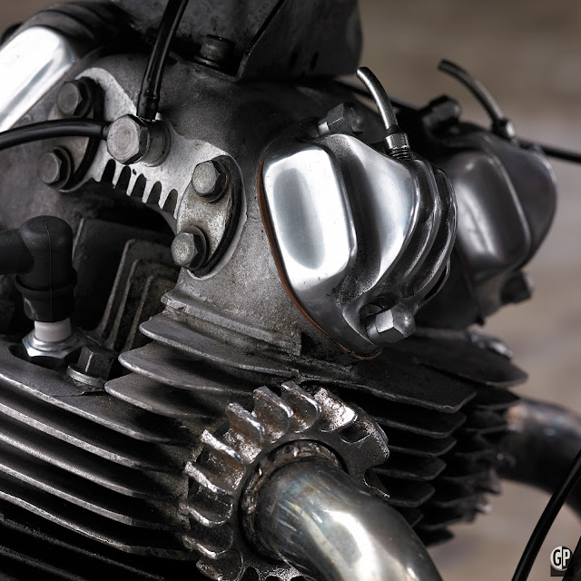 Nothing has been delegated to a subcontractor: everything that has been done on this motorbike, has been done in the garage, and I think I can say that everyone who has set foot in there has particiapated to some extent in the project. Corey Wyatt, who speeded up the process, thanks to his skill and speed at welding and Chaudonnerie; Frédéric Antoine,, for his talents as a blacksmith; Marcel Galinié, the goldsmith/ mechanic,whose milling and lathework, made a big difference onthe bike, Thierry De Miras for his unerring ear which can detect potentially expensive suspicious noises ,Henry Martinez, for his generous inventory of readily available parts; Benoit Guerry for the quality of his photos, and for sharing each disappointment. Vincent Prat, for time spent in the garage discussing things together, thinking about all possible angles by which to advance the project. And for the final touch, Jerome Gone, who brilliantly adjusted the cable throttle!