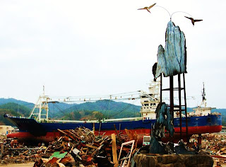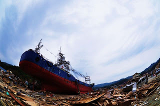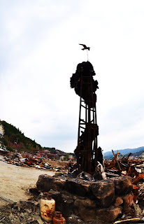300トンはあるマグロ漁船が流れ着き瓦礫の山の中焼けこげた原型のない建物や車とにかく酷い現状の鹿折地区でした。