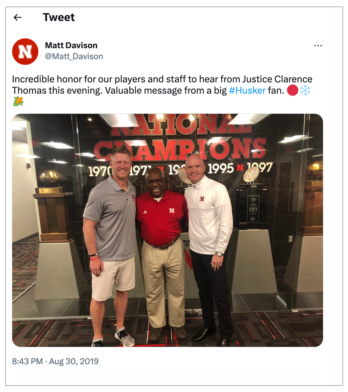 That Saturday, the group watched both the football and volleyball games from luxury suites. The football skybox, which typically costs $40,000 annually, belonged to Tom Osborne, a former Republican congressman who was also the head coach of the team for 25 years. Hosting the Thomases had ripple effects. A local priest requested a ticket for his 87-year-old mother, but the volleyball coach had to tell him none was available. “All of our tickets have been taken for Clarence Thomas and his group,” the coach wrote.