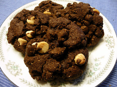 This is a tried and true recipe for oatmeal cookies. It never disappoints. It's from my old Betty Crocker cookbook (copyright 1978). The pictures in it are so '60's, and the recipes may seem a bit dated, but it is hands down, one of my favourite cookbooks. It's full of the kind of comfort dishes I grew up on. The cookie recipe, as written contains no eggs. There is buttermilk, but that is easily substituted. The original doesn't call for chocolate chips, but I just went a little wild and threw some in. The recipe makes a huge batch, but is easily halved.
