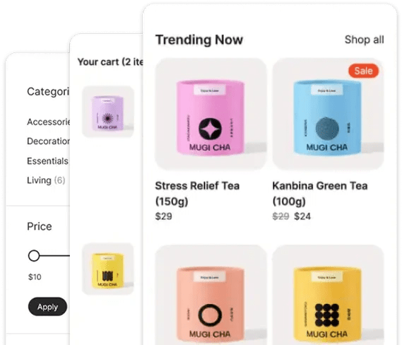 Выберите самый подходящий дизайн из широкого ассортимента торговых тем, оптимизированных для мобильных устройств. Щёлкните по выбранной теме и перетащите на свой сайт, а затем настройте по своему вкусу.