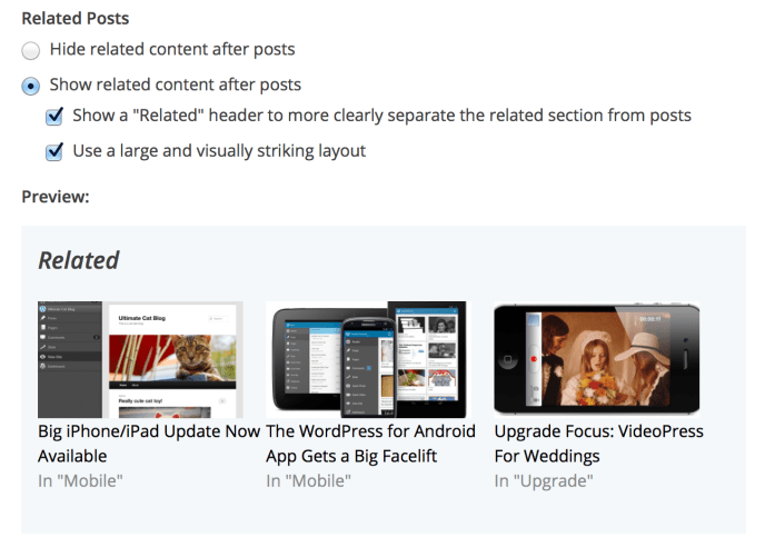 Bu özellik etkinleştirildiğinde, Paylaşım Düğmelerinizin ve WordPress.com Beğenilerinizin (bunları açtıysanız) hemen altında ilgili gönderileri içeren bir bölüm görünür. İlgili gönderileri açmak ve kapatmak için: