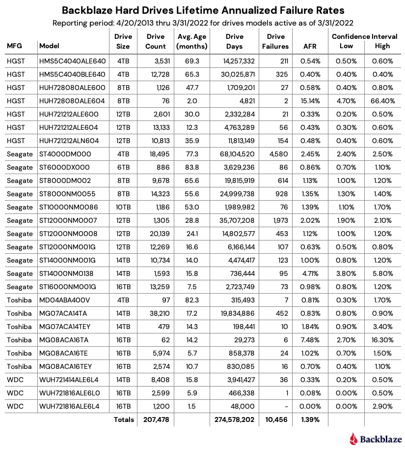 The chart below shows the lifetime annualized failure rates of all the drive models in production as of March 31, 2022.