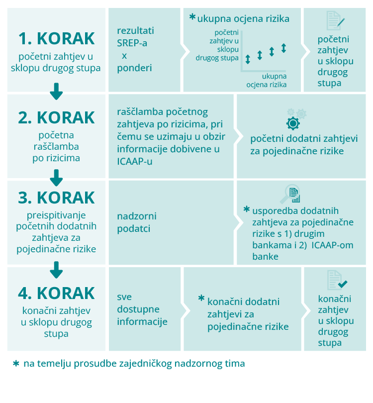 U ovom je ciklusu nadzor banaka ESB‑a primjenjivao pristup koji se sastoji od četiriju koraka pri određivanju zahtjeva u sklopu drugog stupa za pojedinačne banke na temelju pojedinačnih rizika. Svaki od tih četiriju koraka bio je jednako važan. Rezultat tih koraka početni je, cjelovit zahtjev u sklopu drugog stupa utemeljen na sveobuhvatnoj procjeni profila rizičnosti banke koja je dopunjena podrobnijom analizom pojedinačnih pokretača rizika kako bi se odredio konačni zahtjev u sklopu drugog stupa na temelju pojedinačnih rizika.