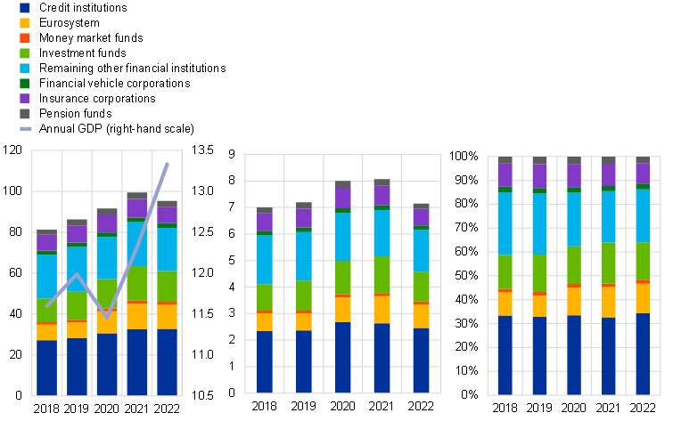 (EUR trillions (left panel, both scales); ratio to nominal GDP (middle panel); percentages (right panel); annual data: 2018‑22)