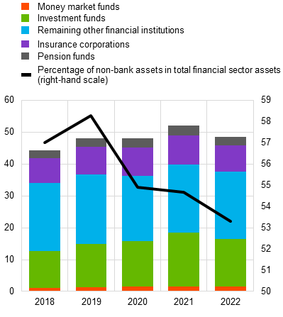 In 2021 the NBFI sector grew to USD 239.3 trillion and its share of total global financial assets increased to 49.2%.[3] The US market grew from USD 43.83 trillion in 2009 to USD 85.3 trillion in 2021. And of greater relevance, the total assets held by non-bank financial institutions in the euro area almost doubled from €25 trillion in 2009 to around €49 trillion in the last quarter of 2022, representing more than half of the financial system.[4] In recent years, the size of the NBFI sector as a share of the euro area financial sector has stabilised and even declined slightly. This may be partly related to market valuation dynamics, so the extent to which these developments are structural or conjectural in nature will need to be examined.
