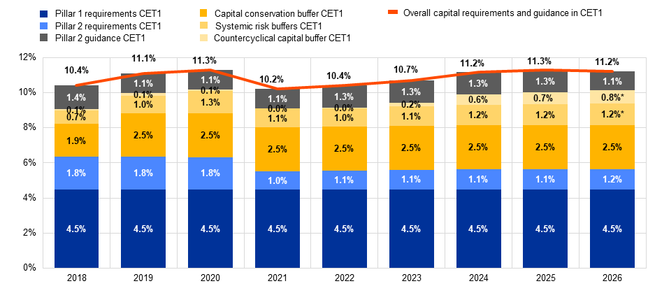 Notes: The sample selection follows the approach outlined in the methodological note for the publication of aggregated supervisory banking statistics. For 2018, the first quarter sample is based on 109 euro area entities, for 2019 on 114 entities, for 2020 on 112 entities, for 2021 on 114 entities, for 2022 on 112 entities, for 2023 on 111 entities, for 2024 on 110 entities and for 2025 on 113 entities. For 2026, the sample is based on 109 entities. The Pillar 2 requirements are applicable from January 2026.