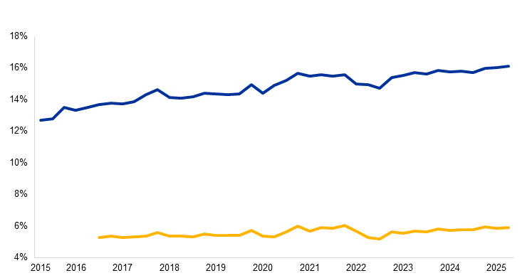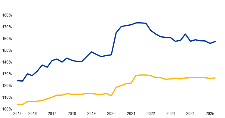 Together, the LCR and NSFR have shifted business models away from excessive reliance on short-term wholesale funding. Today, liquidity positions remain comfortable, with the average LCR standing at around 158% and the NSFR at approximately 127% (Chart 3). Favourable financing conditions are reflected in relatively tight bank bond spreads. However, banks’ growing reliance on market-based funding could pose risks in times of stress.