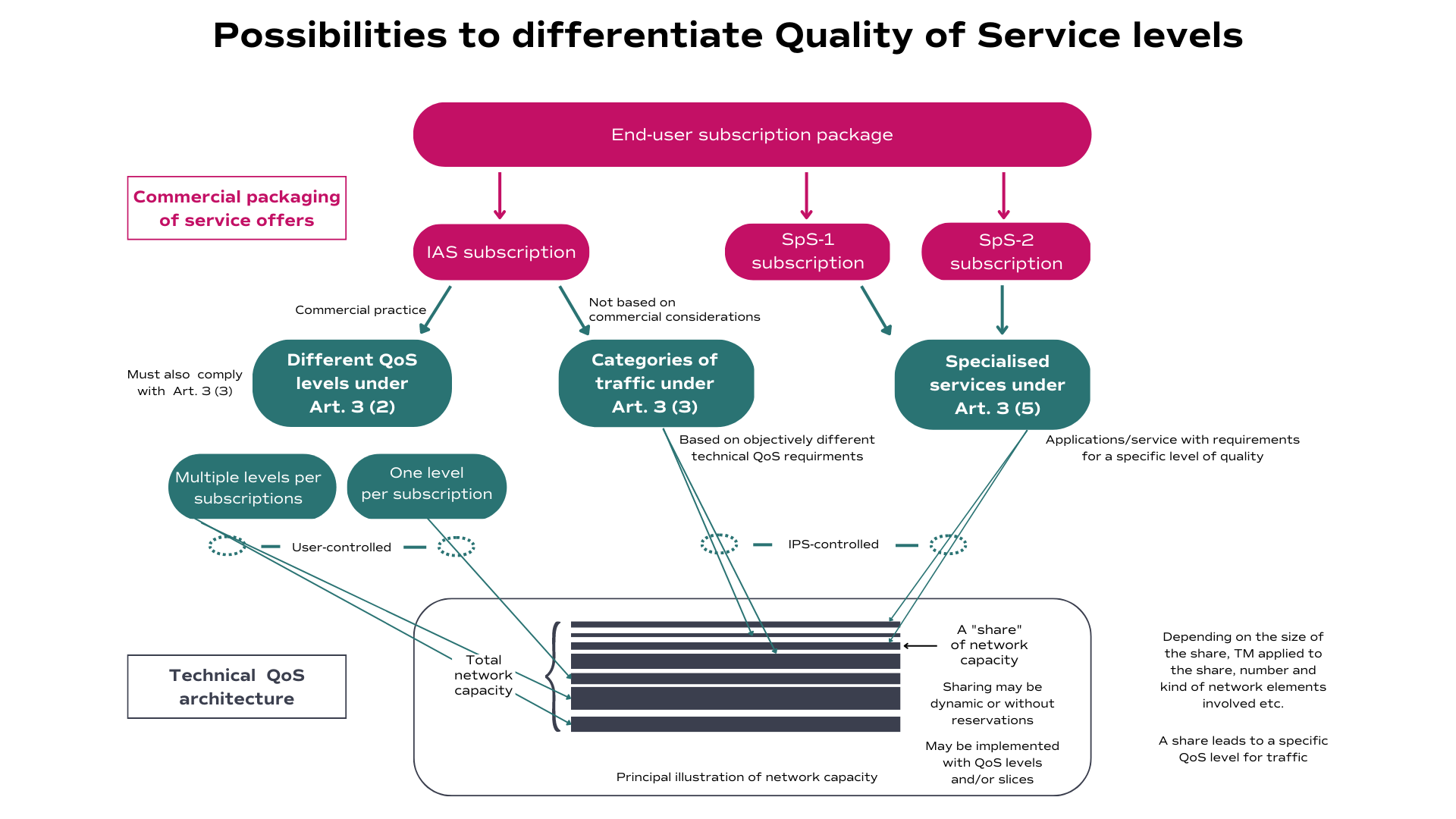 In the first place, the Open Internet Regulation allows offering internet access subscriptions with different Quality of Service (QoS) levels regarding parameters such as speed, latency, jitter and packet loss. It is also possible to offer multiple application-agnostic QoS levels at the same time for a single subscription. These measures may not degrade the quality of other IAS subscriptions to a quality below the contract conditions.