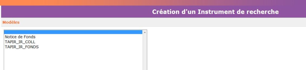 - En sélectionnant la mention « Créer un IR », un modèle « Notice de fonds » est proposé sur la partie centrale juste au-dessus des modèles TapIR destinés au catalogage des manuscrits et archives dans le CGM.