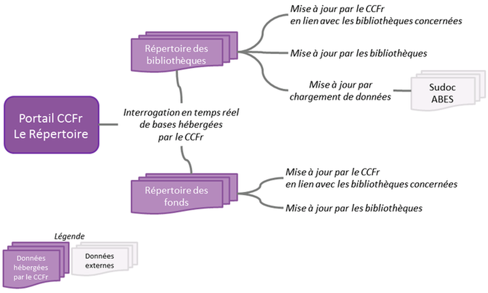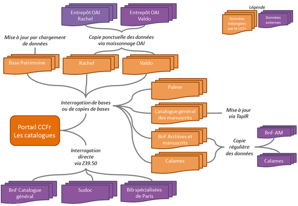 Le protocole OAI-PMH permet de moissonner régulièrement plusieurs entrepôts de bibliothèques ou de réseaux documentaires. La mise à jour dépend à la fois de la fréquence du moissonnage par le CCFr et de la mise à jour des entrepôts sources par les établissements. Les catalogues concernés sont ceux : des réseaux Rachel et Valdo.