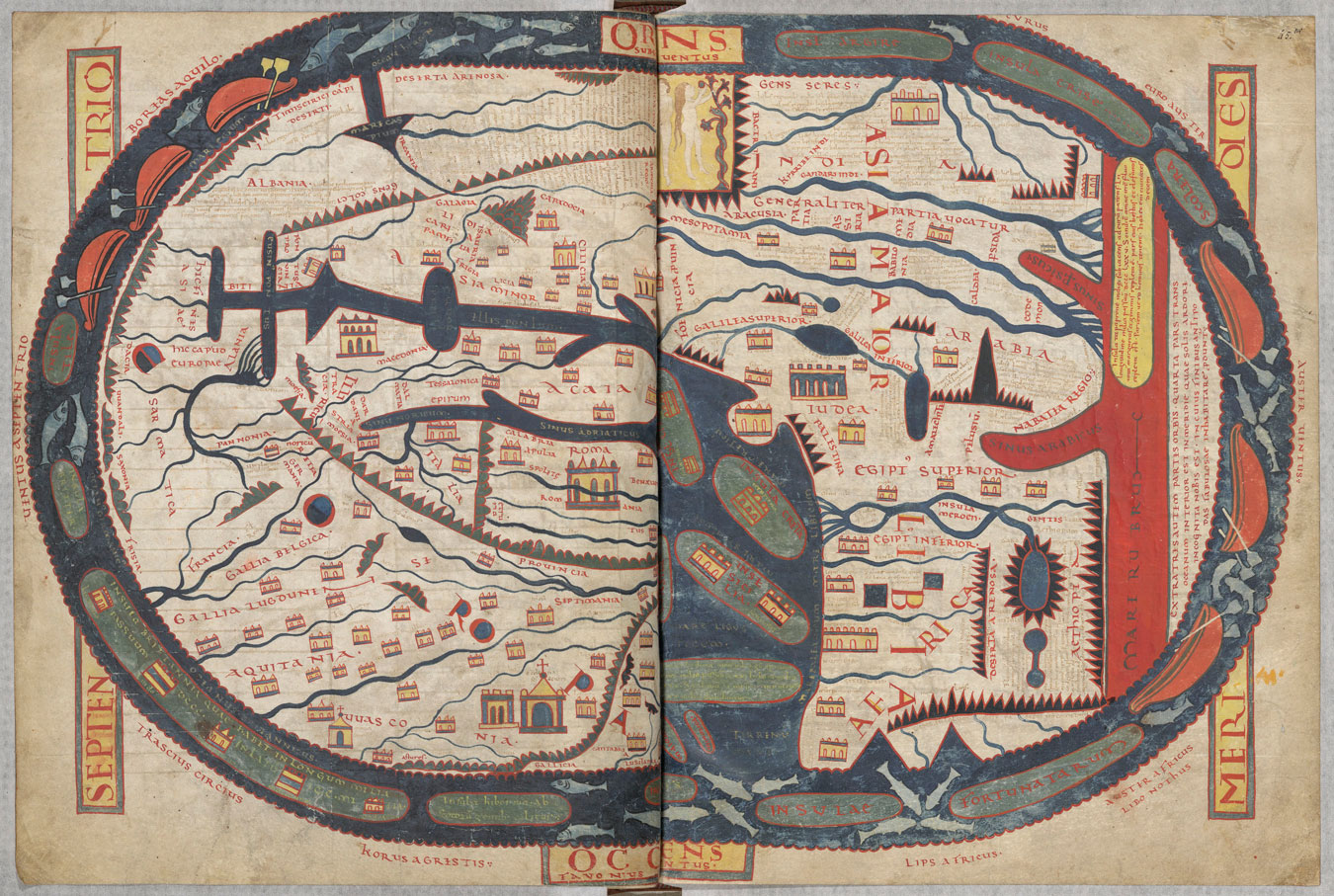 La mappemonde qui se déploie sur deux pages (feuillets 45bisv et 45ter) en est l’un des plus beaux exemples décoratifs. Unique par sa mise en forme, le nombre des toponymes, l’abondance et la longueur des légendes, elle est une véritable somme du savoir géographique disponible au XIe siècle. Surtout, elle donne une position géographique centrale à l’abbaye de Saint-Sever qui s’y présente comme une nouvelle Jérusalem occidentale.