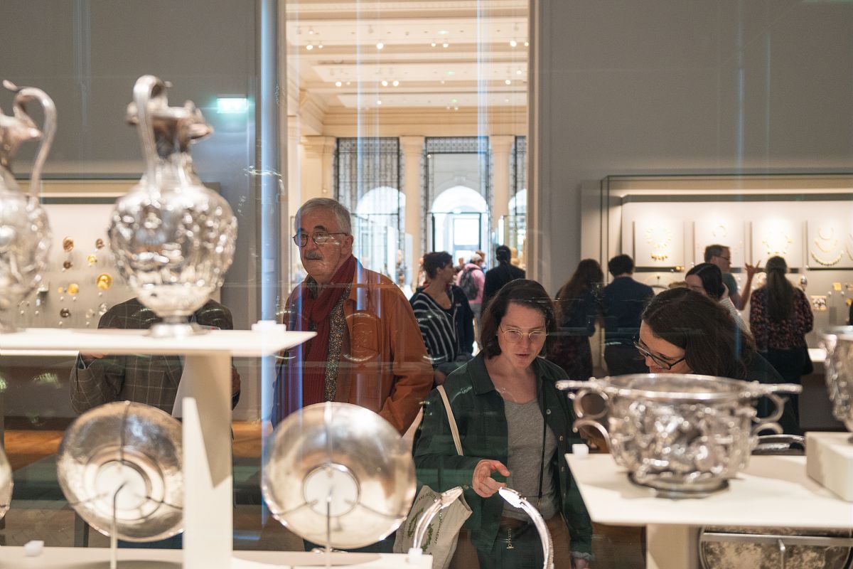 Les autres vitrines présentent de grands plats en argent ou en or qui montrent l’opulence et le raffinement des cours de la fin de l’Antiquité et de l’époque sassanide, ainsi que des bijoux celtes, grecs et romains, des chefs-d’œuvre de l’art de la médaille depuis la Renaissance, ou encore d’exceptionnelles pierres gravées en camée et en intaille.