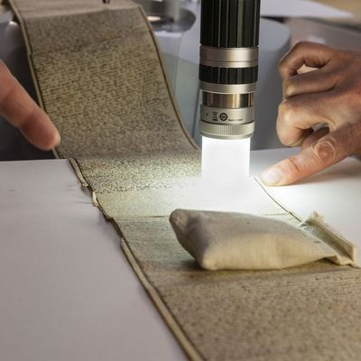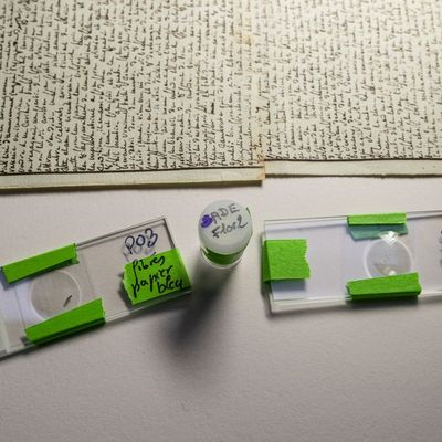 L’histoire de la fabrication du rouleau de Sade est encore entourée de mystères : la restauration est l’occasion d’en apprendre d’avantage sur le document. Pour aider les restauratrices dans l’étude des matériaux sur lesquels elles vont intervenir, l’équipe du laboratoire scientifique a mené des analyses physico-chimiques. Encre, colle, papier, et taches sont passés à la loupe à l’aide de quatre machines spécialisées et de quelques micro-prélèvements.