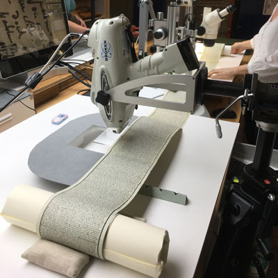Lors des journées de travail consacrées au rouleau de Sade, un véritable rituel s’installe dans l’atelier: le manuscrit est sorti de son coffre-fort et déroulé sur une table lumineuse, permettant de dénicher les zones fragilisées qui nécessitent une intervention. Les instruments de travail sont disposés autour de la table : les scalpels, la pince brucelles, les papiers japonais préencollés (de 3 et 6 g/m²), les colles.