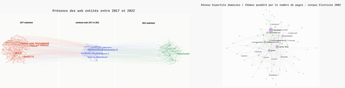 En 2022, une collaboration avec le médialab Sciences Po et la bibliothèque de Sciences Po a permis l’adaptation de l’outil de curation et constitution de corpus Hyphe aux archives de l’Internet. Cet outil permet de faire de la cartographie du web et d’étudier, à partir de liens hypertextes entre les pages, les réseaux d’acteurs. Lors d’un Datasprint organisé au BnF DataLab en 2022, deux équipes ont ainsi travaillé sur les collections web électoral, pour étudier la transformation des communautés politiques de soutien aux candidats à l’élection présidentielle ou encore les représentations du vivant génomique dans les sites collectés lors de l’élection de 2002. Les résultats et la description de la méthodologie employée sont à consulter sur le site dédié.
