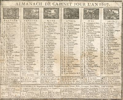Almanach de Cabinet pour l’an 1807, du fonds patrimonial numérisé. Il donne aussi les dates des principales foires du département pour celui de 1807, qui compte encore les départements annexés par la France lors de la Révolution et du Premier Empire (1792 - 1815) : Deux-Nèthes, Dyle, Escaut, Forêts, Jemmapes, Lys, Meuse-Inférieure, Ourthe, Sambre-et-Meuse.