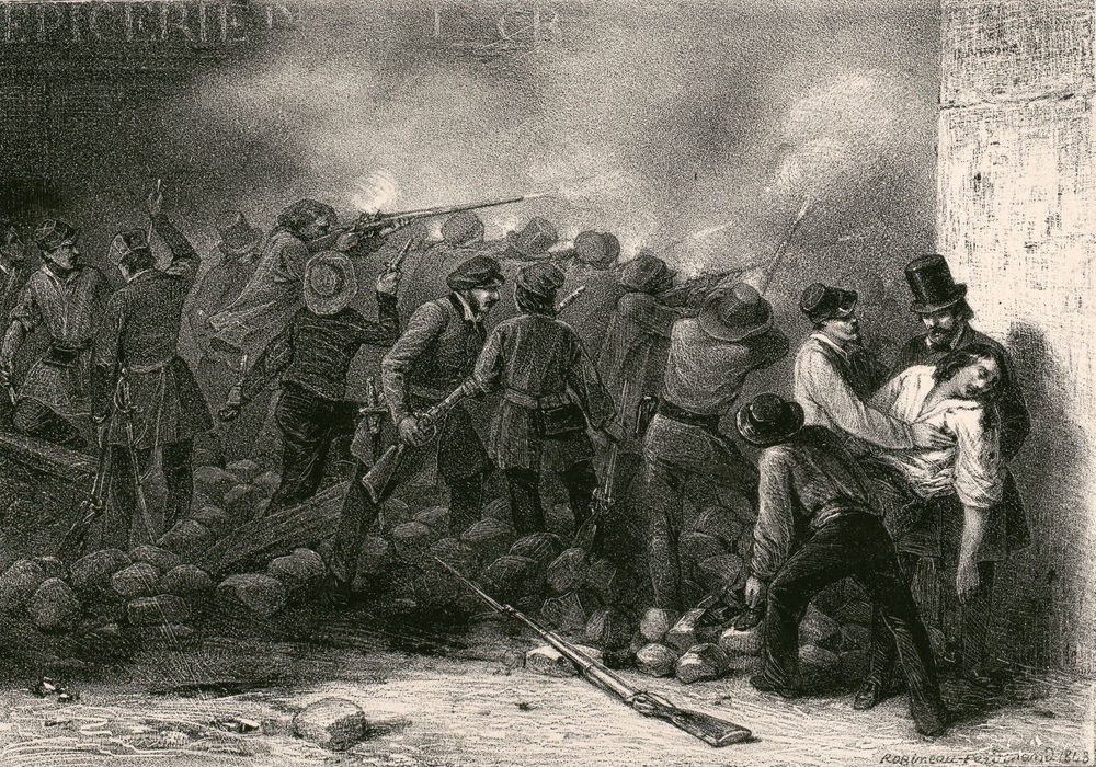 Le 21 juin 1848, les Ateliers nationaux, qui apportaient une réponse sociale et républicaine au chômage des Parisiens, sont fermés. La capitale se hérisse de barricades, surtout dans les quartiers populaires du nord et de l’est… S’ensuivent quatre jours de combats acharnés. Les ouvriers sont défaits et la répression est terrible. Aux 3 à 5000 morts des barricades s’ajoutent 1500 fusillés sans jugement et des déportés et emprisonnés.