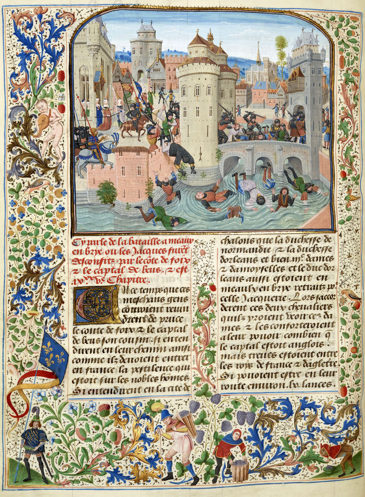 L’enluminure, extraite des Chroniques de Froissart, montre un des épisodes conclusifs de la Grande Jacquerie. Les paysans et les quelques seigneurs qui les ont rejoints se font massacrer par les troupes de Jean de Grailly et Gaston Fébus, alors qu’ils assiégeaient la forteresse du marché de Meaux où était réfugiée la femme du Dauphin.