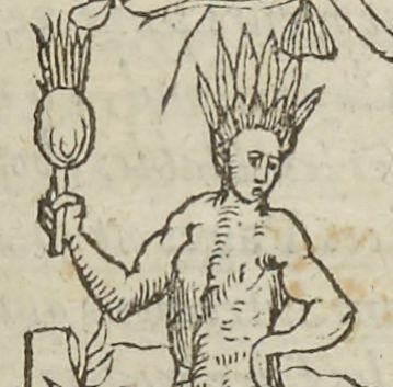 André Thevet, moine cordelier, aumônier de l’expédition dirigée par Nicolas Durand de Villegagnon, demeure une dizaine de semaines au Brésil pendant l’hiver 1555-1556. Malgré la brièveté de son séjour, il rédige, en collaboration avec l’érudit Mathurin Héret, le récit de son voyage. L’ouvrage est plusieurs fois publié, traduit et rencontre une audience internationale. Les éléments ethnographiques sont opposés aux références à l’Antique. Les croyances du peuple Tupinamba qui, selon les auteurs, «adore le Diable par le moyen d’aucuns siens ministres, appellez Pagès», permettent opportunément d’inviter le lecteur chrétien à vivre selon l’écriture sainte et non «comme ces pauvres Sauvages, & plus brutallement que bestes brutes». La gravure représente un chamane portant une coiffe de plumes et tenant une maraca surmontée d’un bouquet de plumes. Elle sera réemployée, imprimée en miroir, pour illustrer La cosmographie universelle, autre livre d’André Thevet, publié en 1575.