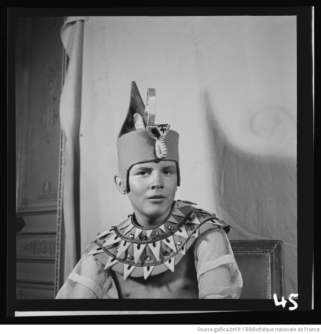 Jacques Perrin (Ptolémée) dans César et Cléopâtre, pièce de Bernard Shaw, mise en scène de Jean Le Poulain, théâtre Sarah Bernhardt, 1957 / Photographie de Roger Pic – BnF, département des Arts du spectacle, NEG-PHO-1 (498).