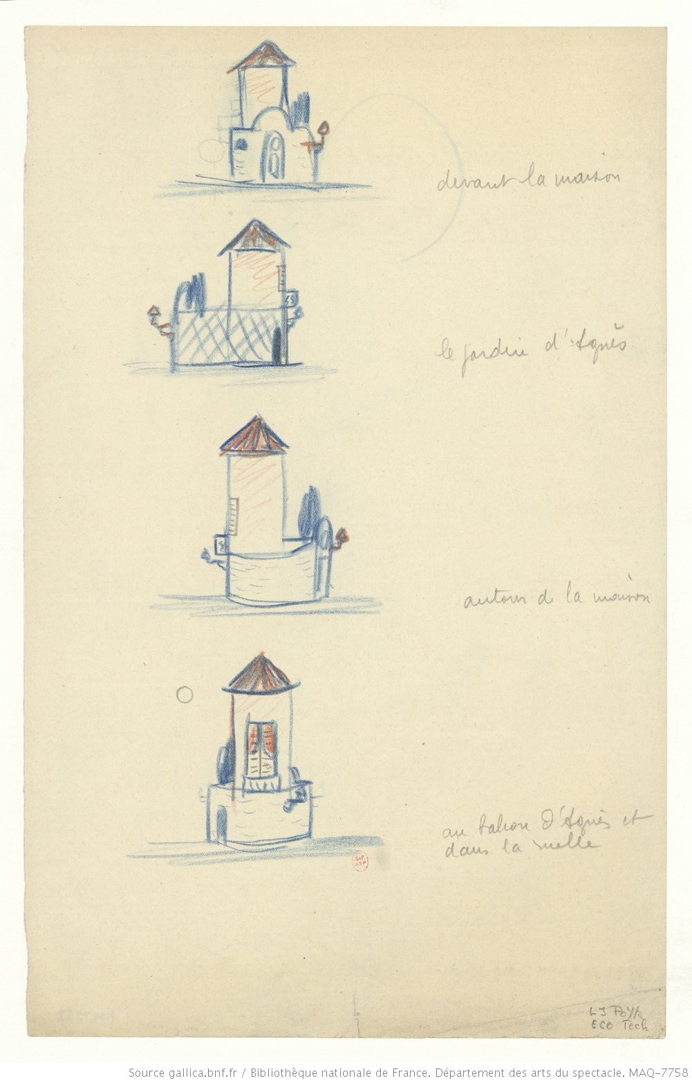 L’École des femmes : La maison et le jardin d’Agnès : 4 études avec indications manuscrites - Projet de film de Louis Jouvet et Max Ophüls, 1941. Dessin de Christian Bérard (1902-1949). Bibliothèque nationale de France, département des Arts du spectacle, 4-MAQ-7758