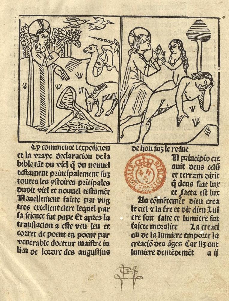 Les imprimeurs lyonnais furent les premiers en France à introduire des bois gravés dans leurs livres. Version tardive de la Bible moralisée, l’Exposition de la Bible est l’un des premiers livres français illustrés. L’ouvrage propose un choix de courts passages scripturaires suivis de commentaires portant sur leur sens spirituel. Il contient 40 gravures sur bois dans le texte. Ces bois, de style typiquement lyonnais, ont été gravés sur place. Le livre semble avoir connu un certain succès car Huss en donna deux éditions successives. Cinq exemplaires seulement de cette première édition ont été conservés.