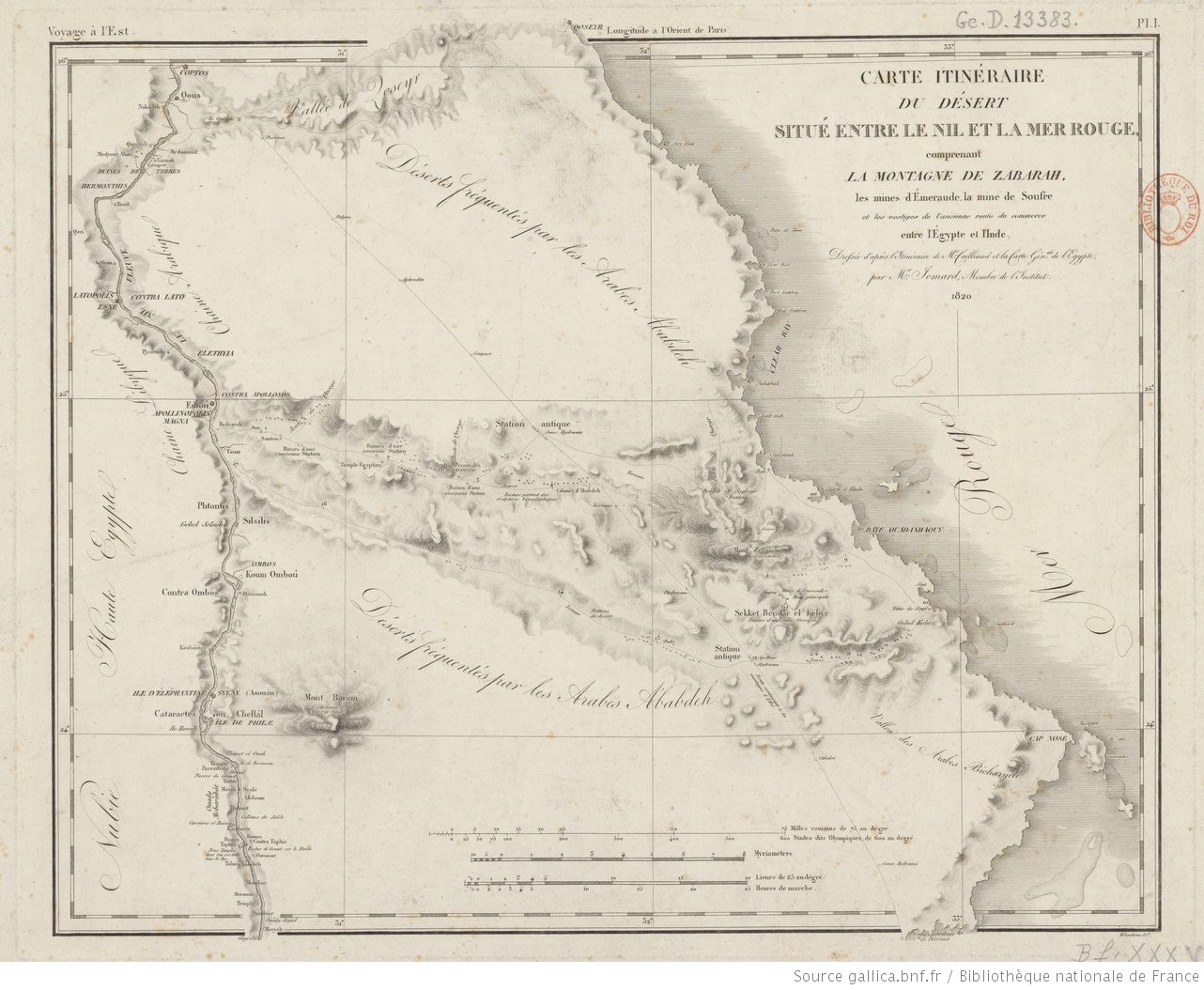 Carte itinéraire du désert situé entre le Nil et la mer Rouge, comprenant la montagne de Zabarah… et les vestiges de l’ancienne route de commerce entre l’Egypte et l’Inde