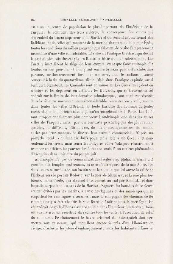 Elisée Reclus (1830-1905), géographe et militant anarchiste, rédige seul sa Nouvelle géographie universelle. Dans les volumes couvrant l’Europe, notamment dans le premier consacré à l’Europe méridionale, il s’attache à montrer la diversité de cette partie du continent, véritable carrefour, en illustrant par exemple la variété des populations qui composent Andrinople (Edirne) aux confins de la Bulgarie, de la Grèce et de la Turquie.
