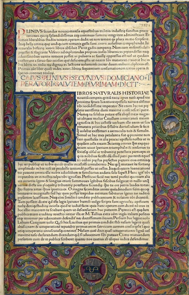 Jean de Spire, son éditeur installé à Venise, mourut brusquement après avoir publié en 1469 à deux reprises les Epistulae ad familiares de Cicéron, puis cette édition princeps de Pline. Le texte de cette édition de Pline reproduit tel quel le texte corrompu du manuscrit qui avait servi de copie à l’imprimeur. L’édition fut donc rapidement supplantée par celle établie par Giovanni Andrea Bussi, imprimée à Rome en 1470. Ornée de grandes initiales à rinceaux dits bianchi girari, l’exemplaire sur vélin ici reproduit comporte au premier feuillet un encadrement de feuilles stylisées sur fond d’or, de facture bien différente et ajouté sans doute ultérieurement à l’intention de Peter Ugelheimer, dont les armes figurent au bas de la page. Issu d’une famille de marchands de Francfort et marchand lui-même, Ugelheimer s’installa à Venise où, tout en poursuivant son négoce il devint l’un des bailleurs de fonds des premiers imprimeurs vénitiens.