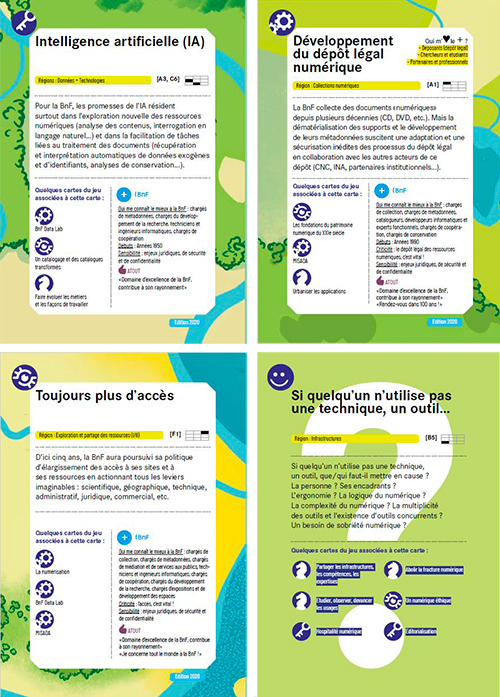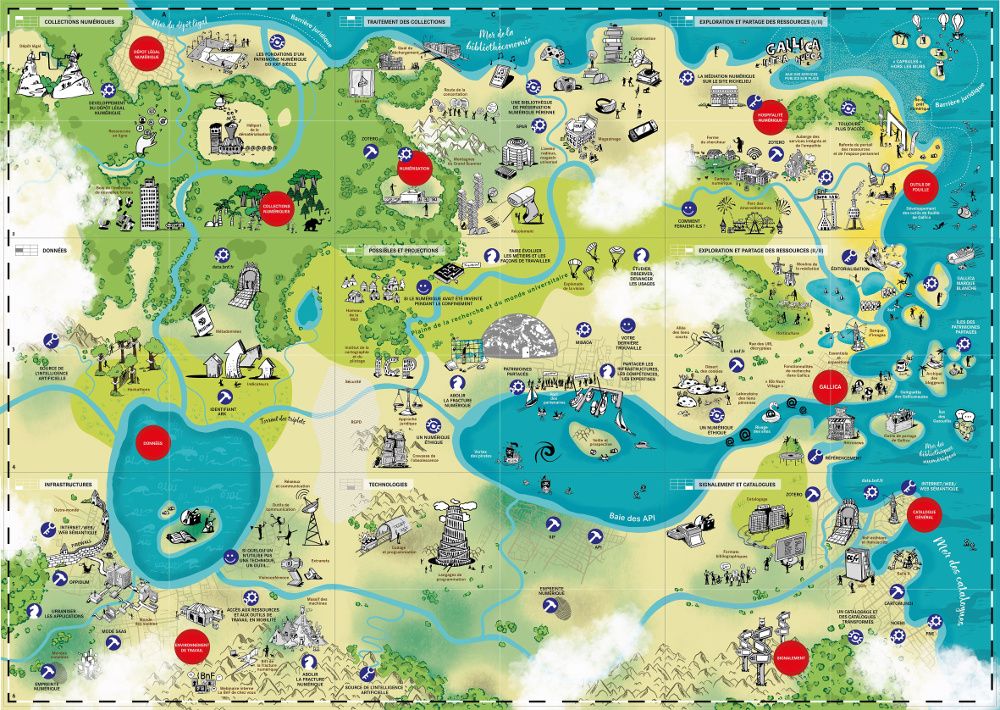 Ces cartes décrivent les différentes notions, les principales actions et les axes directeurs de la vie numérique de la Bibliothèque nationale de France.