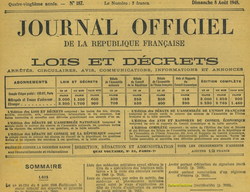 - le Journal officiel de la République française (JORF) pour les décrets publiés à partir de 1924.