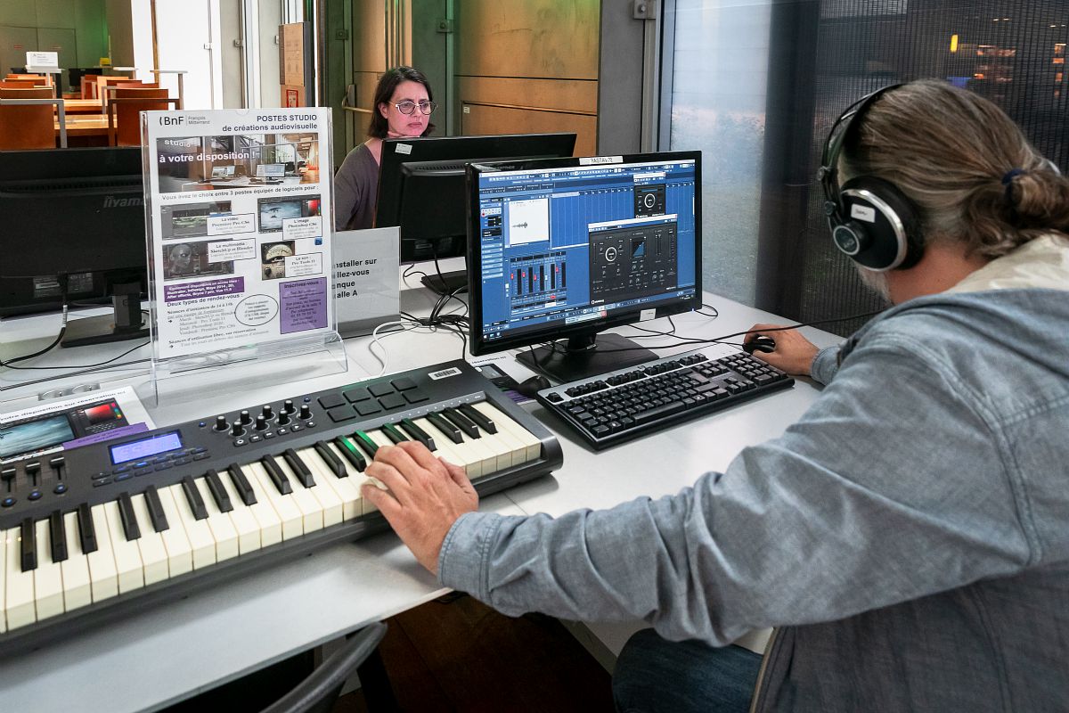 Situé en salle A, le studio de création audiovisuelle est accessible sur réservation. Il permet de réaliser du montage vidéo, de la 3D, de la retouche d’image et plus encore. L’accès est gratuit pour les usagers de la Bibliothèque détenteurs d’un Pass BnF Lecture / Culture ou d’un Pass Recherche.