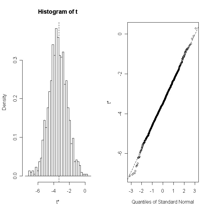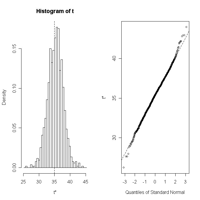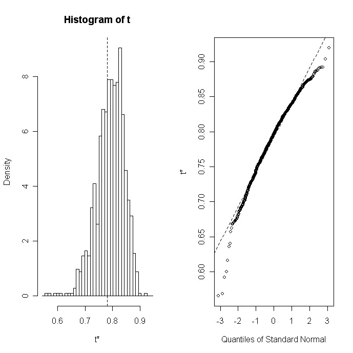 Une fois que vous avez généré les échantillons bootstrap, print(bootobject) et plot(bootobject) peuvent être utilisés pour examiner les résultats. Si les résultats semblent raisonnables, vous pouvez utiliser la fonction boot.ci( ) pour obtenir des intervalles de confiance pour les statistiques.