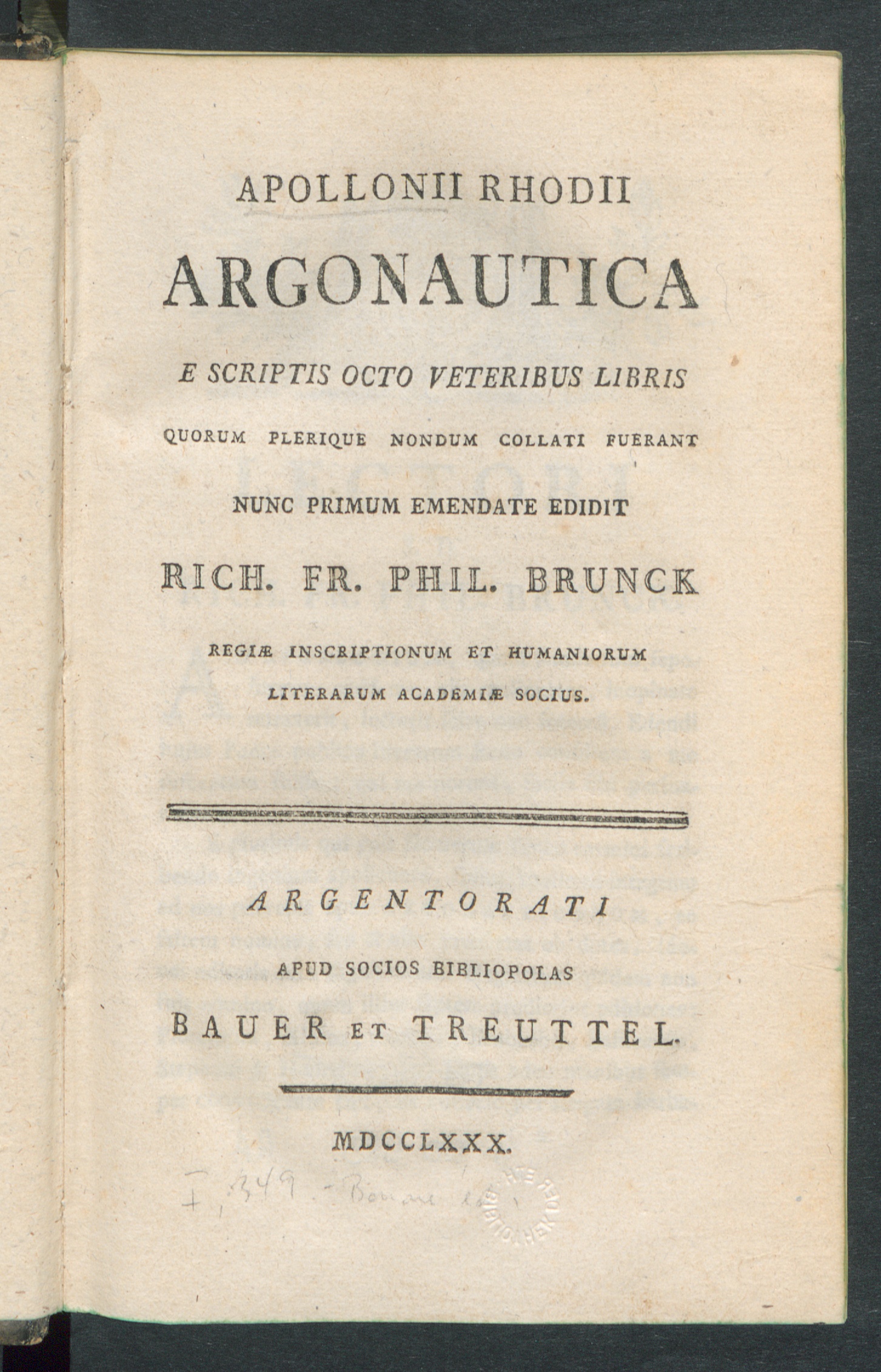 Apollonii Rhodii Argonautica / Apollonius Rhodius ; e scriptis octo veteribus libris quorum plerique nondum collati fuerant nunc primum emendate edidit Rich. Fr. Phil. Brunck