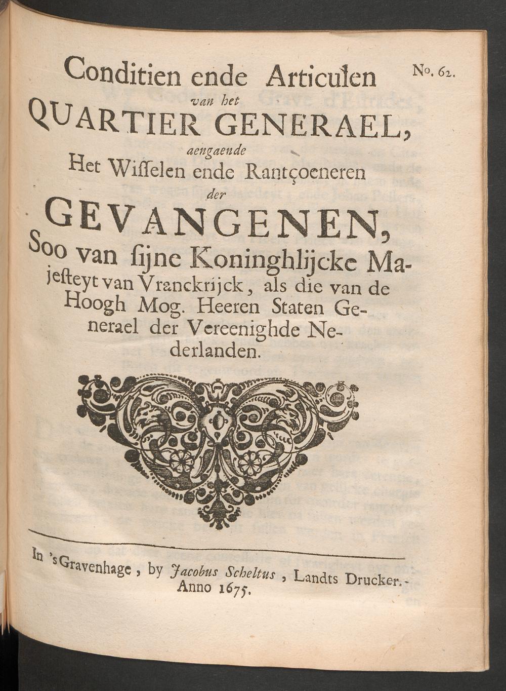 Conditien ende Articulen van het Quartier Generael, aengaende Het Wisselen ende Rantçoeneren der Gevangenen, Soo van Sijne Koninghlijcke Majesteyt van Vranckrijck, als die van de Hoogh Mog. Heeren Staten Generael der Vereenighde Nederlanden