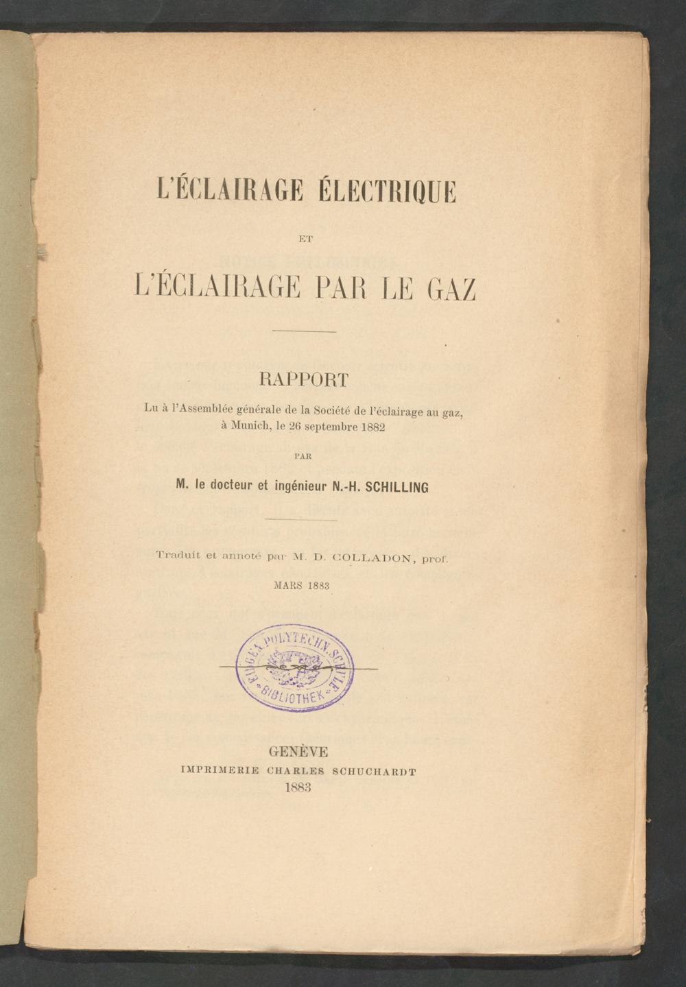 L' éclairage électrique et l'éclairage par le gaz : rapport lu à l'assemblée générale de la Société de l'éclairage au gaz, à Munich, le 26 septembre 1882 / par N.-H. Schilling ; Traduit et annoté par M. D. Colladon