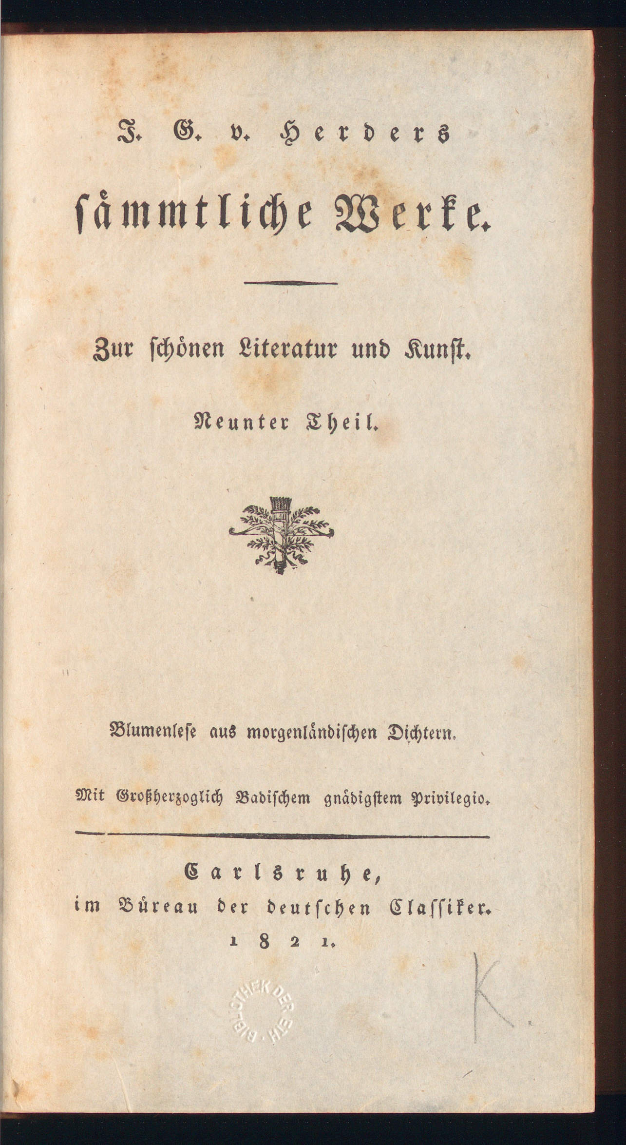 9 (1821) Blumenlese aus morgenländischen Dichtern / Johann Gottfried Herder