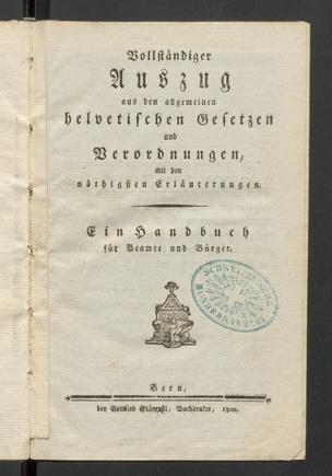 Vollständiger Auszug aus den allgemeinen helvetischen Gesetzen und Verordnungen, mit den nöthigsten Erläuterungen : ein Handbuch für Beamte und Bürger