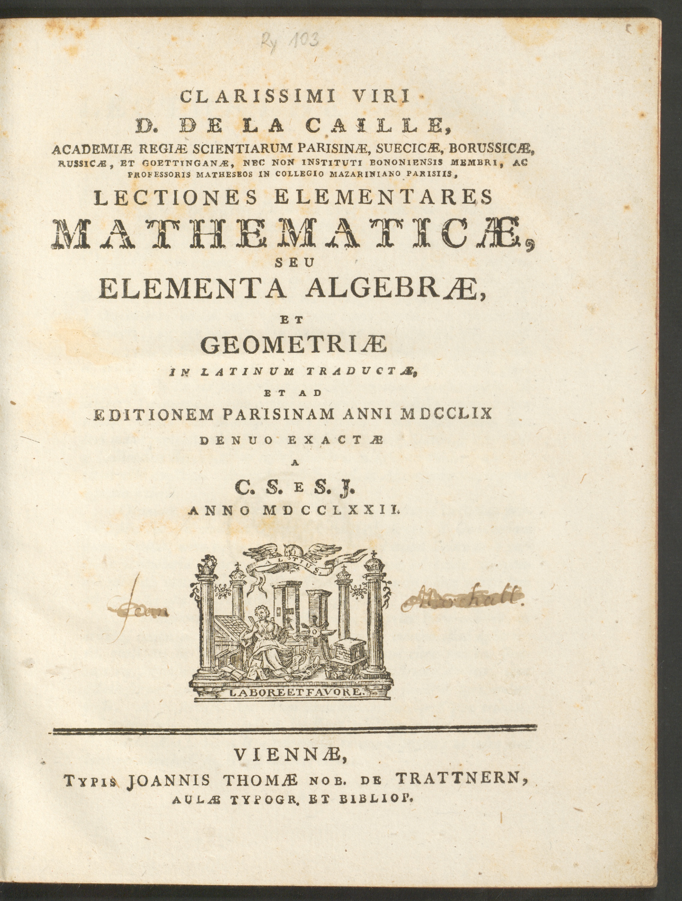 Clarissimi Viri D. De La Caille ... Lectiones Elementares Mathematicæ, Seu Elementa Algebræ Et Geometriæ / In Latinum Traductæ Et Ad Editionem Parisinam Anni MDCCLIX Denuo Exactæ A C.S. e S.J. Anno MDCCLXXII