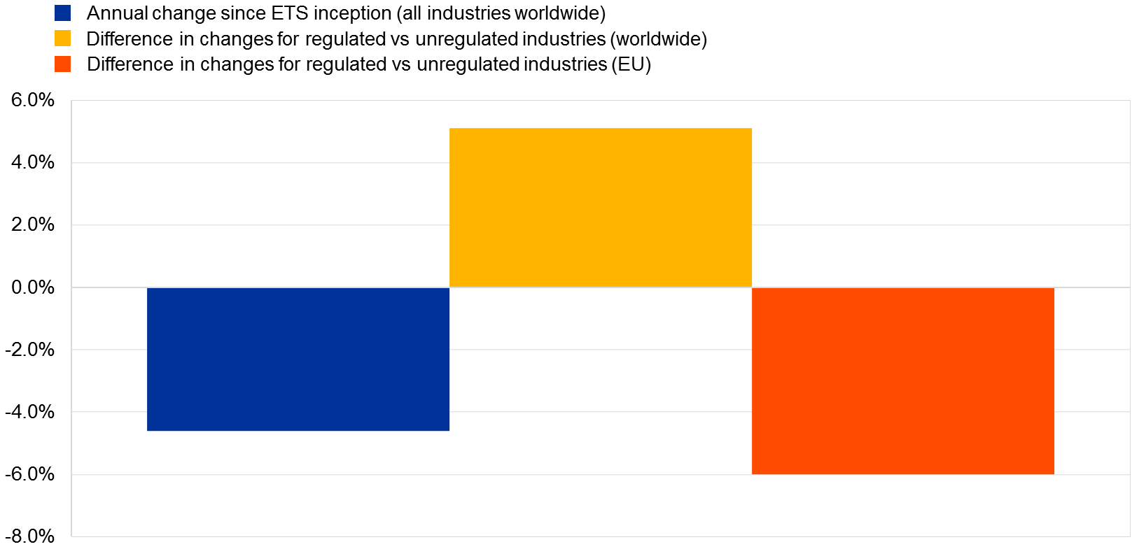 Notes: The blue bar is the average decline in emissions since ETS inception across all countries and sectors (-4.6 percentage points). The red bar depicts the difference in GHG emissions in ETS sectors globally relative to the average decline. The yellow bar shows the difference in emissions in ETS sectors within the EU relative to average change in emissions of ETS industries.