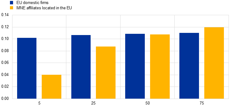 Notes: The chart depicts the effect on companies’ production of a one percentage point shift of high carbon footprint inputs, across sourcing regions, from inside to outside the EU. For a 10 percentage point shift across regions of high carbon footprint inputs, EU companies expand production by 1 percentage point, compared to a no-shift strategy. This is based on regression analysis (for details see “Benefits and costs of the ETS in the EU, a lesson learned for the CBAM design”). The log value of sectoral production is regressed on country-sector-ownership fixed effects, emission intensity (emissions per euro worth of production), log value of inputs and the four shares of high carbon footprint inputs sourced from Domestic and MNE companies. The coefficients on these four regressors capture the elasticity of sectoral production to emission-intensive inputs depending on the regions in which they originated, e.g. from inside or outside the EU, as well as company ownership. The specification also includes the interaction of these shares with the price paid on allowances in t-1, to capture nonlinearity of the price for allowances. Finally, the specification encompasses deterministic country and industry trends and control for unobserved time heterogeneity. Matching the AMNE and WIOD databases eventually yields 34 sectors and 44 countries (including RoW) spanning the period 2000-16. Regulated (ETS) industries are Coke and refined petroleum products (C19), Basic metals (C24), Other non-metallic mineral products (C23), Electricity, gas, water, waste and remediation (DTE), and Transport and storage (H).