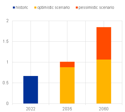 Climate change can also affect other key economic variables that matter for monetary policy and its transmission to the real economy and prices, such as potential output. While not directly measurable, potential output is important for understanding the degree of inflationary pressures. It represents the highest level of output the economy can sustain without generating inflation. Imagine potential output as the speed limit for the economy – once economic activity exceeds potential output, inflationary pressures rise and central banks have to start putting their foot on the brake.